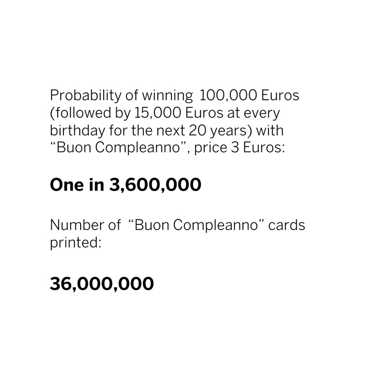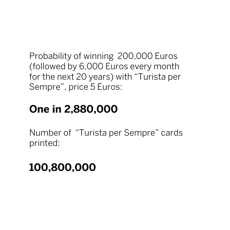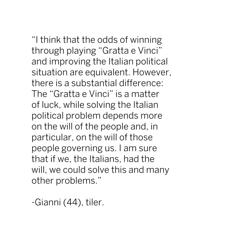 I used only regional trains between Reggio Calabria and Domodossola on a line which exists since more than hundred years and that allowed Italians, millions of Italians, to emigrate, to the north of Italy, to the north of Europe in the hope for a better future. I wanted to ask them (and myself), if is easier to improve your life by winning one of those scratch cards or by doing something to actively change the current political situation. I asked this question to common people, the one that with the change, after paying the bills or after an espresso, they buy a couple of “Gratta e Vinci”, because “… You never know!” Because, as Adam Smith said: “Rarely even the more educated people consider crazy to pay a little sums in exchange of the possibility to win a much bigger one.” People who don’t have impossible dreams but who just want a normal life with a work, an house and the possibility to have a family.