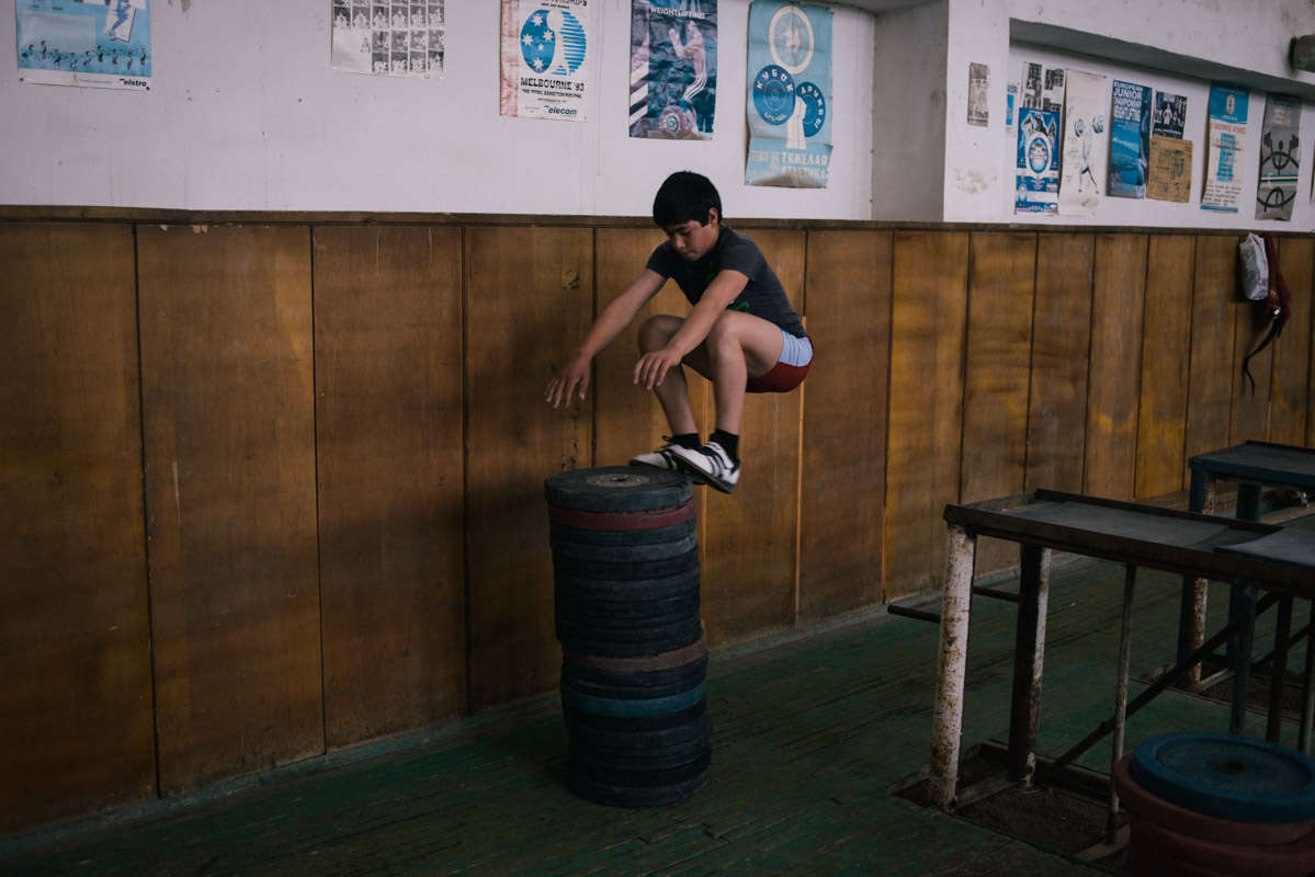 A child trains weightlifting in the village of Geghakert, Armenia. The run-down gym produced several world champions but many athletes choose to migrate to other countries due to the dire economical situation of Armenia. After 1991, the country remained geographically isolated, cut off from Azerbaijan and Turkey, and industry formerly dependent on the Soviet Union collapsed.