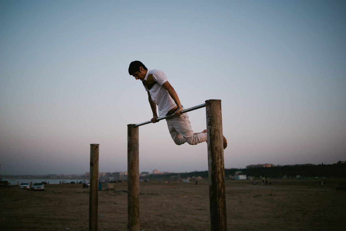 A man performs a muscle up besides the Caspian Sea in Sumgait, Azerbaijan. During Soviet times Sumgait was the major petrol chemical hub of USSR and was home for both Armenians and Azerbaijanis skilled workers.