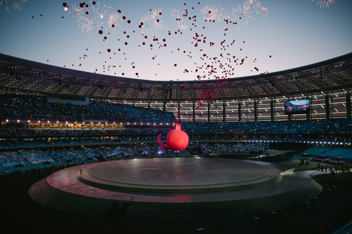 The elaborate opening ceremony of the European Games in Baku. A gigantic pomegranate opens up to release a flurry of heart-shaped balloons. The fruit is abundant in both Azerbaijan and Armenia and both countries consider it a national symbol.