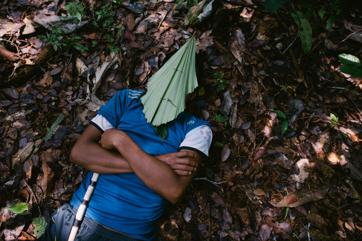 A young person rest during a three day fasting in the forest before the ayahuasca ritual to become visionary warrior. Visions are essential to the culture of Wampis people, as explained by Andres Noningo, 62: “Our visionaries would spend up to three months in the forest. They taught us that every animal and tree are people just like us and have their guardians which protect them.”