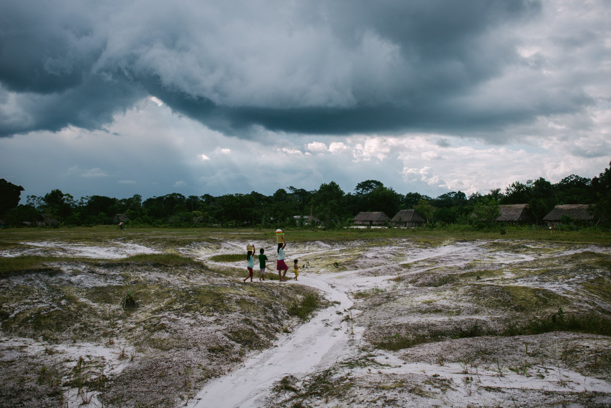 Children play football under heavy rain in the community of Soledad. The Wampis territory, roughly the size of Connecticut, is inhabited by 20,000 people. There are no roads and the two main rivers, Rio Santiago and Rio Morona (Kanus and Kankun respectively in the Wampis language), are the only access to trade and to the outer word.
