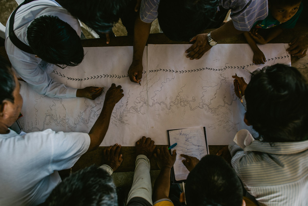 Members of different communities of the Wampis Nation mapping the traditional use of territory along the meandering Morona river. Only parts of the land rights are recognized by Peruvian legislation. Ancestral uses, like hunting or vision seeking, are granted only by the Inter-American Court of Human Rights, which protects the right of indigenous peoples to own and manage their territories.