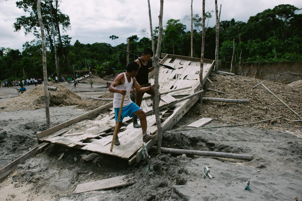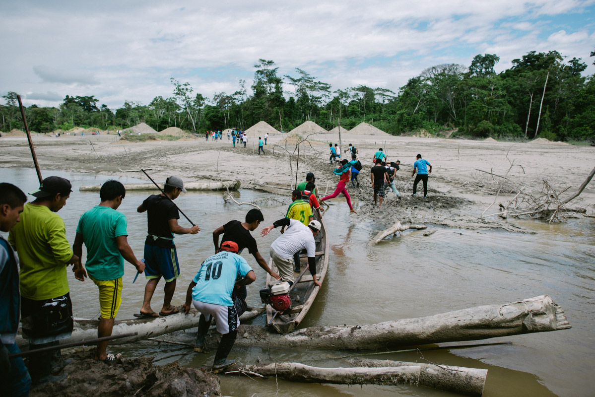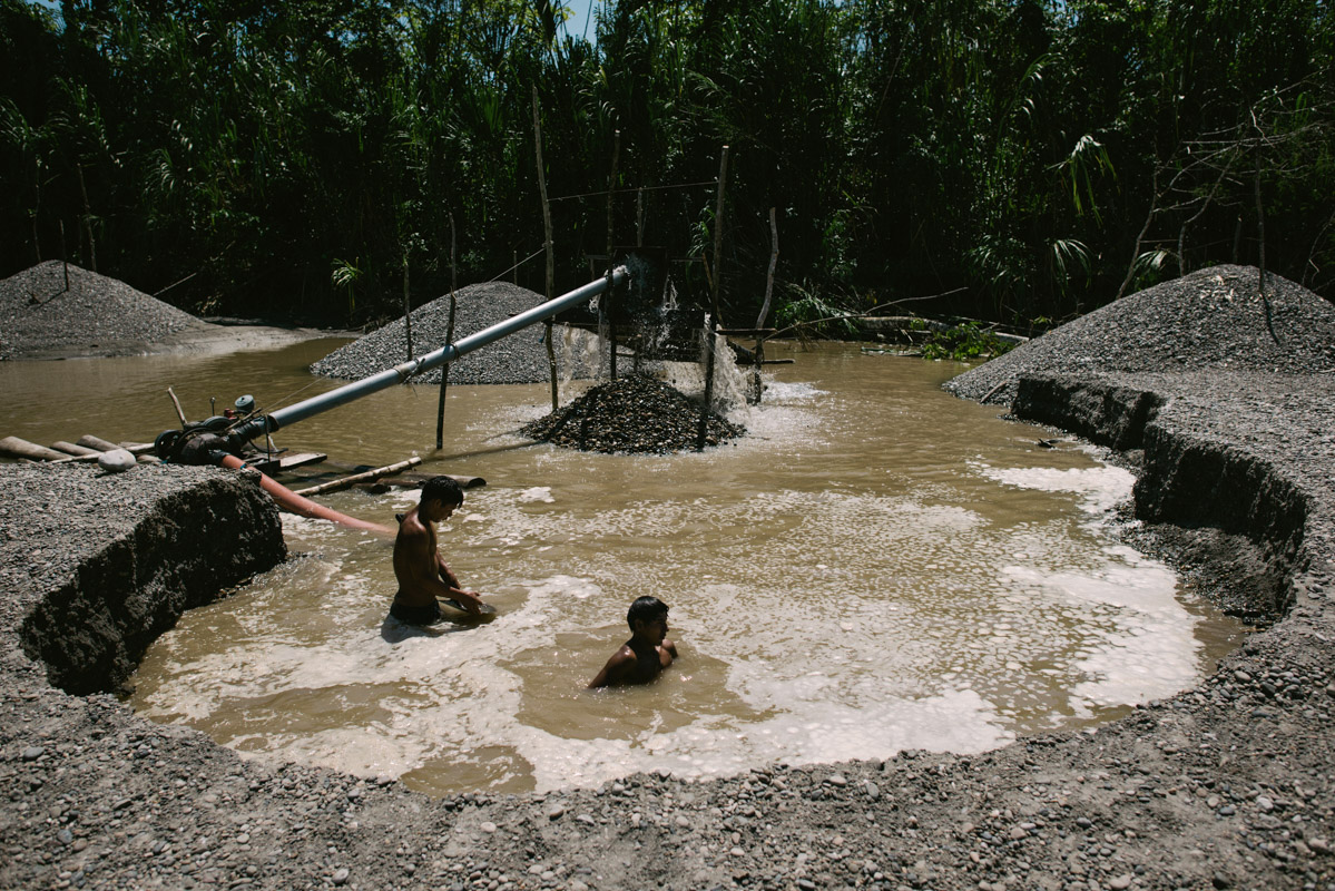 Illegal miners extract gold from sediment on the Marañón river. Illegal gold mining is very prevalent in the region, where an estimated 20-120 grammes can be harvested in a day, worth between $600-$3,000 (£465-£2,320), a lot of money in this poor area. Aside from the destructive impact on the landscape, gold mining commonly involves the use of mercury, which leeches into the water and the food chain.