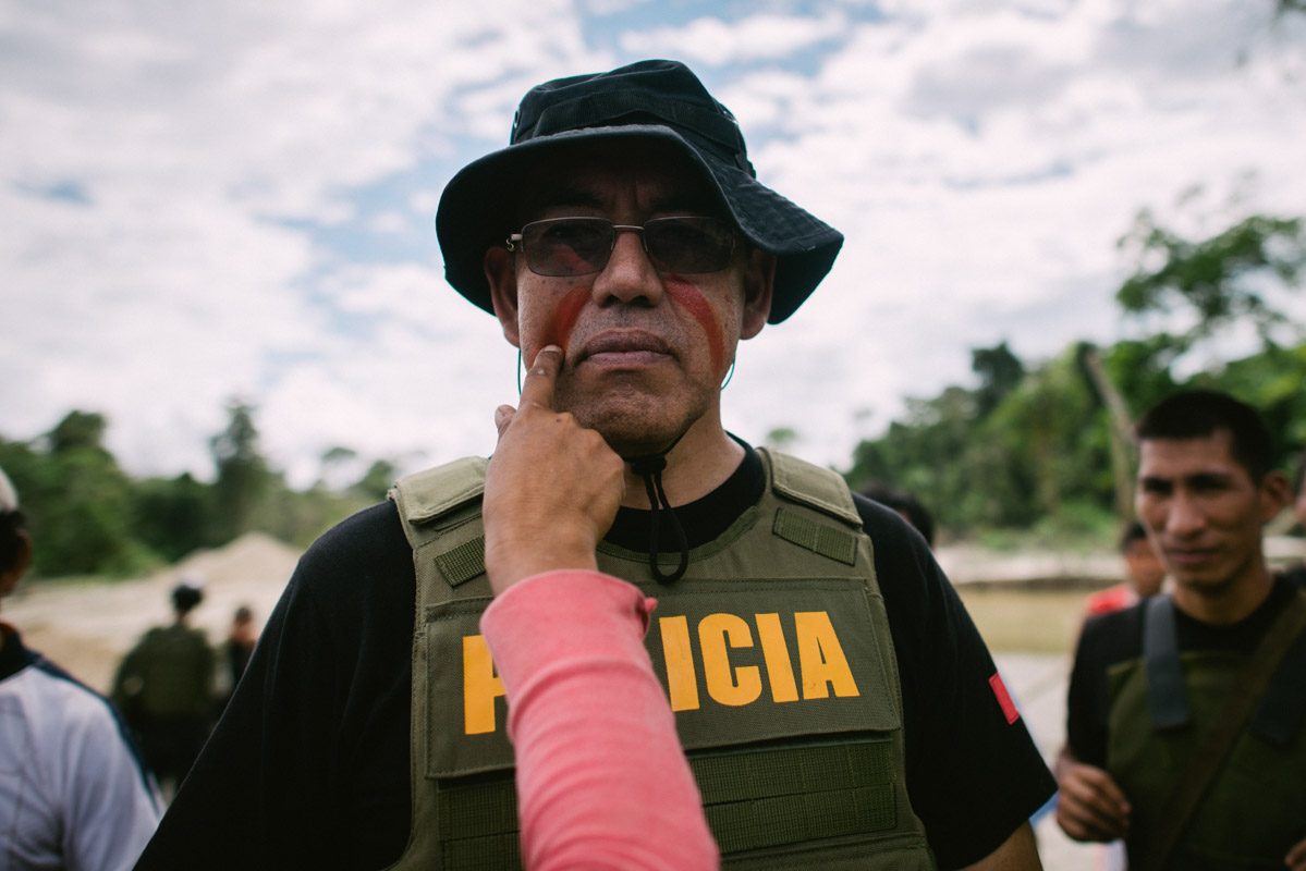 The chief of the police receives his warrior face painting during a protest along the Pastacillo tributary, as a sign he is an ally in the fight against illegal gold mining. The Peruvian government is engaged in a well advertised fight against illegal miners, which unfortunately seems to be ineffective.
