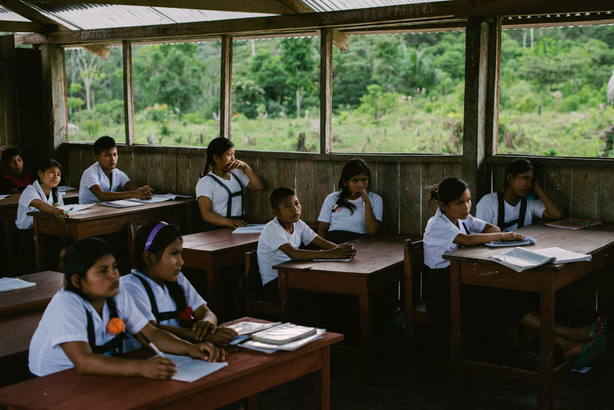 A class in the secondary school in Soledad. School classes, taught in Spanish and in Wampis language, are a strong force of cultural homogenisation, teaching values of a consumeristic society. By contrast Wampis people grow up with an intimate connection with nature and a deep faith that the natural world will provide for all their needs. Higher education is possible only in far away cities.