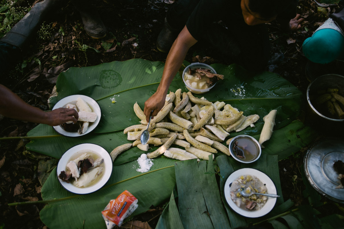 Lunch break during work in a chackra. Chakras are ancestral plots of land belonging to the community but temporarily used by individual families. During the day a family usually spends time cultivating its chakra. Common harvests include banana and yucca, which make up the core of the Wampis’ diet. Little cacao plantations are becoming common, allowing people to sell some of their crop.