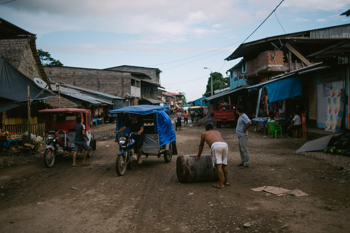 A busy day in the town of La Poza on Rio Santiago. Situated few hours of navigation away from Santa Maria della Nieva, the only road access to Rio Santiago, the town is booming as a frontier place. Here indigenous people can exchange their money with products sold by settlers and miners can sell their gold.