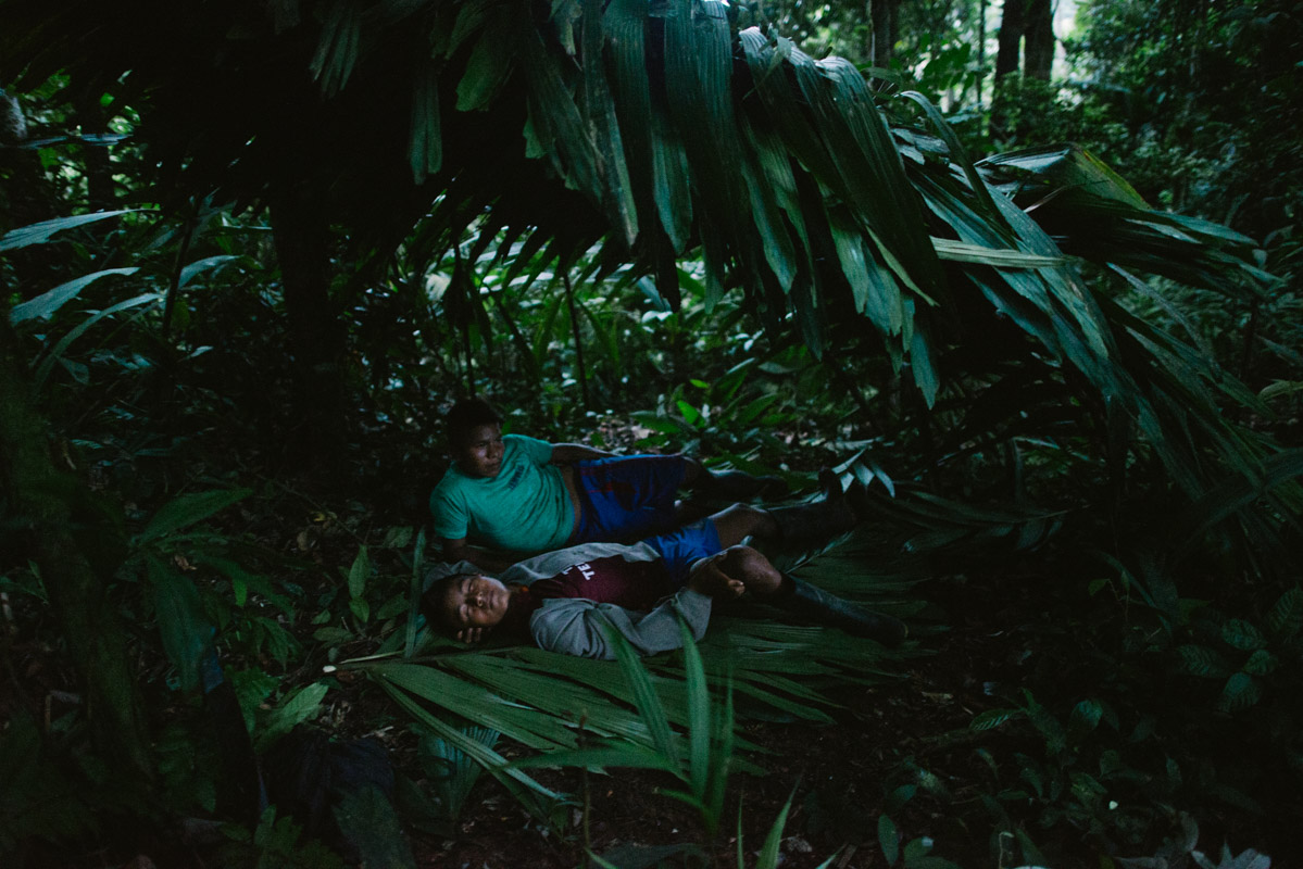 Teenagers rest in a tambo, a construction quickly made with leaves in the forest. “By talking to nature” -continues Andres Noningo, “our ancestors were able to teach us where the animals live, where they reproduce, which lands are fertile and which are not, where we should make a farm and how to hunt with respect, using our anent, sacred songs that ensure we treat all living beings with dignity.