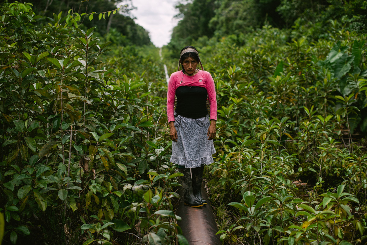 A lady walks on the North Peruvian Pipeline the 13km separating the community of Mayuriaga from the latest oil spill. The pipeline, which is long overdue to be replaced, connects the Tigre region, in north-eastern Peru, to the coast. Leaks and spills are frequent.