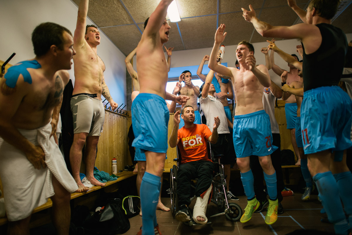 Locker Room of Ellan Vannin after the semi final victory against Arameans Suryoye. Ellan Vannin is the local name for the Isle of Man, a self-governing British Crown Dependency located between Northern Ireland and Scotland. James McStay broke his leg in an earlier match against Kurdistan.
