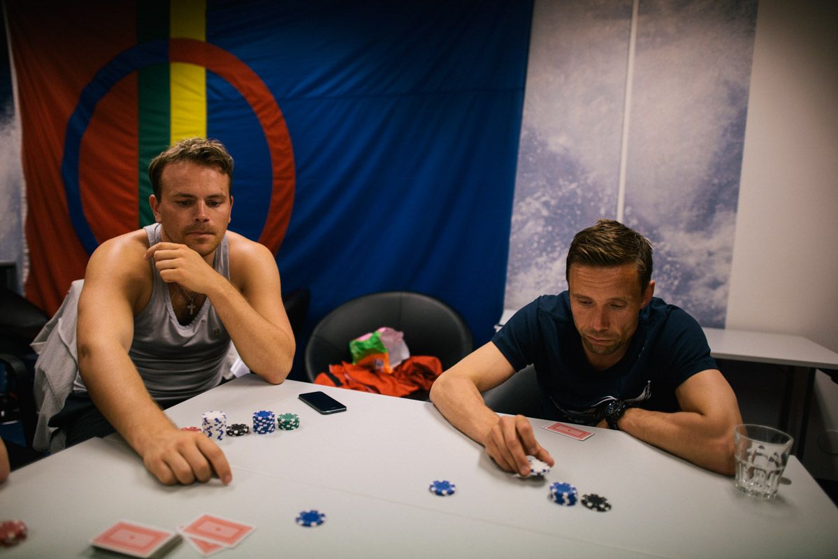 Evening in the hotel for the Sami players of Sapmi. (on the back the flag of Sapmi).